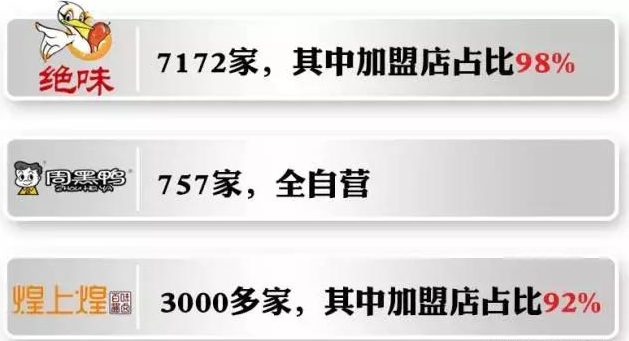 因此,在三大天王里,周黑鴨最年輕,但成為品牌勢能最強的一家。因發展前期吃過加盟的虧,周黑鴨采取了全直營的模式。