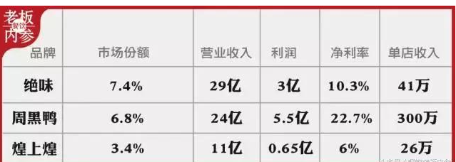 從以上表格中的數據來看,周黑鴨店面數量最少,但賺錢能力最強。煌上煌最新披露的2016年度財報顯示,盡管業績增長迅猛,營業收入超過12億,凈利潤突破1億,相比其他兩家,依然顯得遜色。