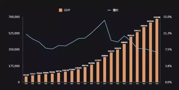 經濟增長大家收入增加了,財富增加了,所以房價上漲了,名義經濟增長和實際增長之后的一個差異。大家可以看到在1995年,中國全國GDP大概在6萬億左右,2015年中國的GDP是67萬億,整整增長了11倍。