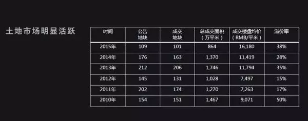上海從土地市場來看,我們看到也有一些變化,如圖,2010年,上海的市場很熱,土地市場也很熱,所以成交的土地單價達到了9000塊,當時的漲幅是50%,2011年市場下來了,土地成交單價是7000塊左右,漲幅只有17%,2012年市場照樣很熱,土地還是只有7500左右,漲幅是15%。2013年市場已經開始走熱了,所以成交單價到了11000左右,溢價率到了35%。2014年市場走弱,所以土地的平均成交均價幾乎沒有變化。到2015年,成交額比2014年漲了50%,溢價率達到38%。