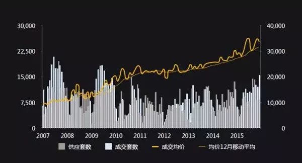這個是2007年到2015年上海樓市的平均走勢,黃線是它的月成交價格,黃色虛線是12個月的平均移動價格。這個圖表我們可以清晰地看到,每一輪調控都是有效的,每一輪調控都深深地打擊了未來3-6個月的成交,可能也進而引起了當時的一個短期價格。不過從長期來看,調控幾乎對成交價格是無效的,它并不能改變房價上漲的趨勢。