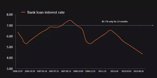 這里說起1998年到現在,中國的人民銀行給的基礎利率走勢,跟我們很多的直覺相反,我們可以看到在高增長的經濟因素背景下,基礎利率高于7%的年份只有三個月,大部分年份中國的利率在6%上下波動,什么意思呢?