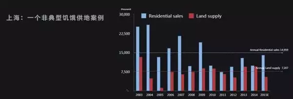 所以這種情況下,大部分地方想做到饑餓供地其實并不容易。但是有些地方可以做到,比如說北京、上海。給大家看一下上海的情況,這是從上海公開招拍掛以來,2003年以來,上海全部的商業土地供應狀況,大家可以看得非常非常清楚。13年下來,每一年相應的住宅的銷售是超過土地供應的。平均一下我們可以看到,每年的住宅銷售的面積大概在1500萬平方米左右,我說的都是樓板面積。每年的住宅類土地供應大概在700多萬平方米左右,大概是銷售出去住宅的一半,正好是一半。這意味著什么?這意味著相應的住宅土地供應嚴重供不應求,難怪上海的價格會漲得這么快。