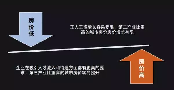 我們可以觀察到,在GDP相仿的城市,第二產業比重較高的房價較低,第三產業比重較高的房價較高。