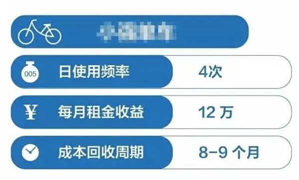 共享單車加盟商的廣告中,會把高收益放在核心位置,什么“半年回收成本”、“8個月賺60萬”等等,且品牌商還會給創業者一套數據依據。這里普遍會提及的,有三個點:日均騎行次數、小時或月收入、成本回收周期。