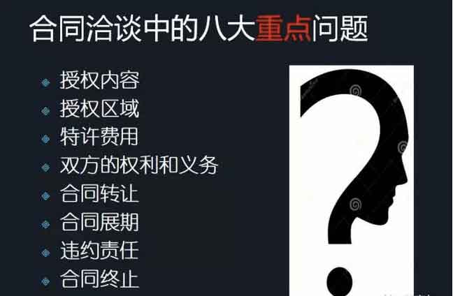 在這個過程中,要著重關注一些重點問題:比如總部的品牌授權包括的具體內容;授權區域,包括保護區情況;特許費用;雙方的權利和義務;合同是否可以轉讓,轉讓條件是什么;合同續約條件;違約責任;合同終止的條件等等。