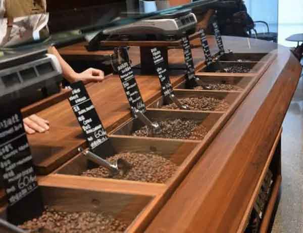 推開“劇場”的大門,最引人注目的無疑是貫穿上下兩層閃閃發光的巨型咖啡生豆儲存銅罐,銅罐表面刻有1000 多個中國印章,纂刻著“果香”、“日曬”、“手沖”等咖啡文化。銅罐與烘焙罐通過透明的管道連接,生豆經烘焙冷卻后,經由一條條流線型咖啡“交響”管道,進入吧臺。像過山車一樣的通道,從烘焙區延伸到零售區成弧線,你能親眼看到、聽到一顆顆鮮嫩綠色的咖啡豆變成棕色的美妙過程。
