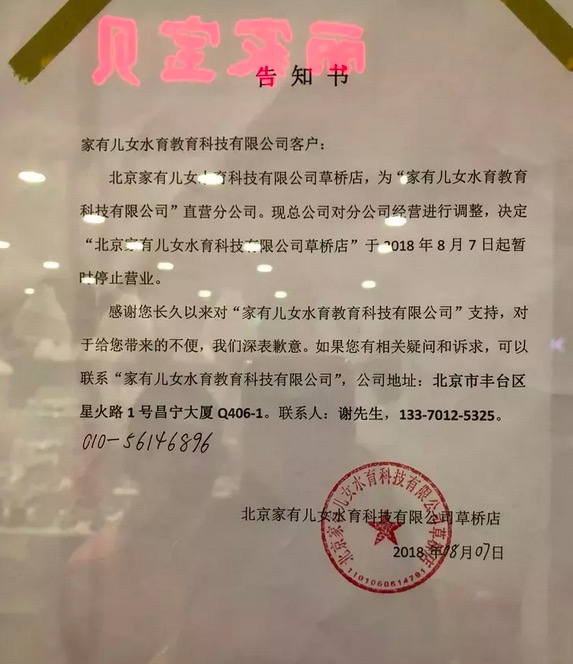 北京商報記者在家有兒女草橋店現場看到,門店已經關閉,大門右側貼有告知書顯示,鋪該店于8月7日開始暫停營業。事實上,8月8日,家有兒女草橋店全體會員曾收到一則短信通知,稱該店主體權、財產權和運營權全部歸屬投資商袁瓊,因市場競爭激烈,房租成本和人力成本太高,導致本店持續性處于虧損狀態“我公司多次和袁瓊先生溝通爭取袁瓊先生的意見。最終,袁瓊先生選擇單方面閉店,因該店歸屬袁瓊先生,我方只能配合。”