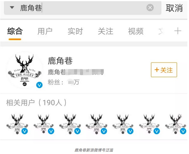 在新浪微博中,搜索鹿角巷竟有190個相關(guān)用戶。其中,“鹿角巷”和“鹿角巷官方微博”發(fā)布眾多邀請加盟的內(nèi)容,且評論和互動內(nèi)容很少。