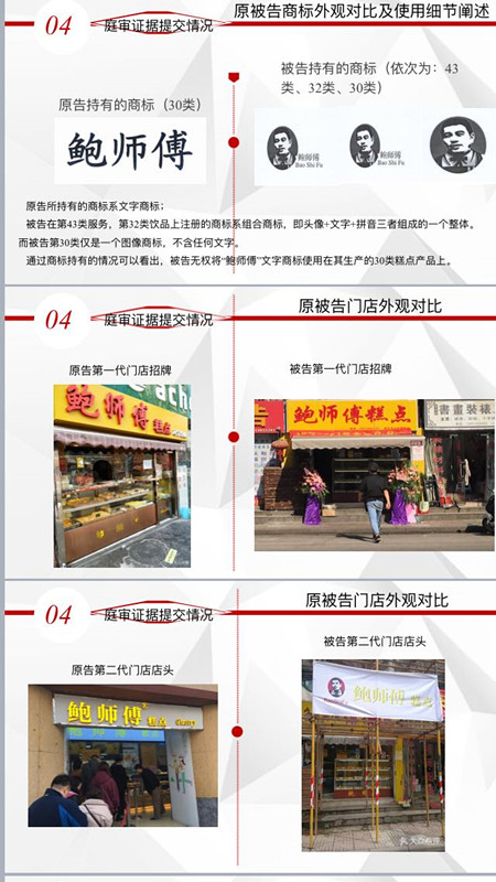 訴江寧鮑師傅食品店案中,原告稱,2017年9月發現被告未經授權將原告的注冊商標“鮑師傅”作為店名使用,“鮑師傅糕點”使用在柜臺以及同類商品上,嚴重侵權。