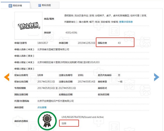 其中,還需注意的是,雖然有些品牌商標是注冊成功的,但要看它是否注冊了43類商標。因為在45個類別商標中,第43類商標對于餐飲行業才是核心商標。