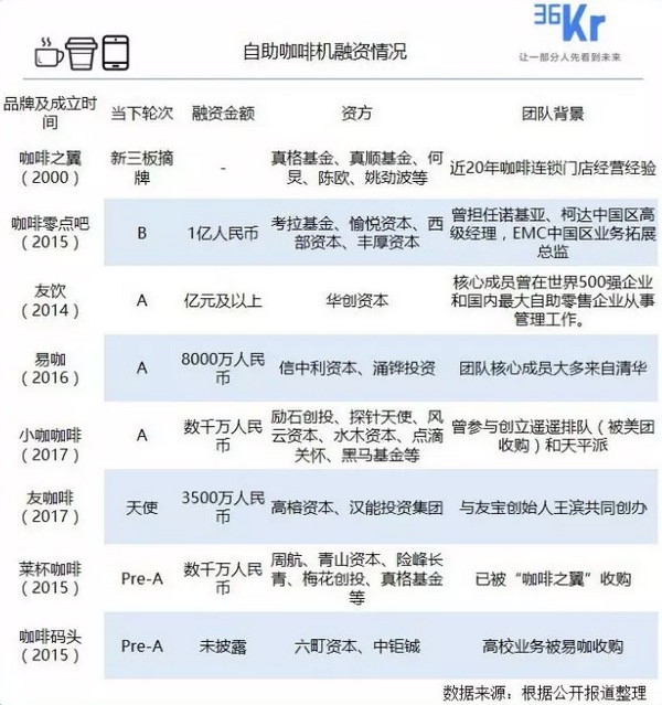 萊杯咖啡則成立于2015年,主要自助咖啡無人零售,成立至今共獲得3輪融資:2016年9月,獲易到用車數百萬種子輪融資;2017年3月,獲青山資本、險峰長青領投,梅花創投跟投的1000萬元天使融資;2017年6月,獲真格基金領投,梅花創投跟投的數千萬元Pre-A輪融資。