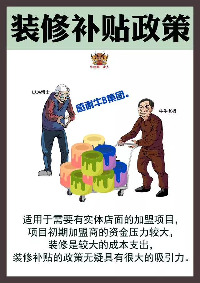 裝修補貼不建議用現金的方式進行直補,適合用裝修物料的方式進行補貼,每個加盟店面用到的物料材質基本一致,所以招商企業有批量采購裝修物料的優勢,采購成本低。