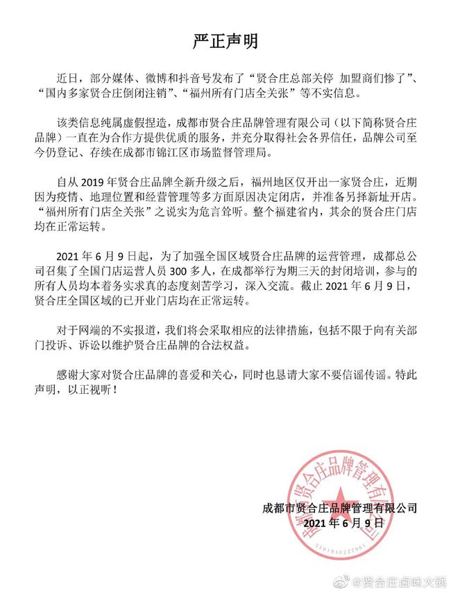 然而對上述消息,6月9日下午,賢合莊在其官方微博上發布聲明表示,這些消息純屬捏造,福州地區僅一家賢合莊,福建省內其余門店均在正常運轉。