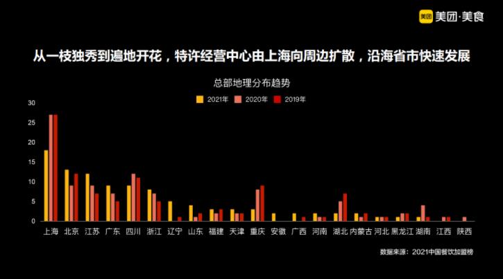 “下沉化”的另一表現是,特許經營中心由上海向其他省市擴散。榜單顯示,2021年上榜企業注冊在遼寧、天津、山東、江蘇、浙江、福建、廣東、廣西等省市的數量均同比增加,其中,江蘇、廣東最為突出。