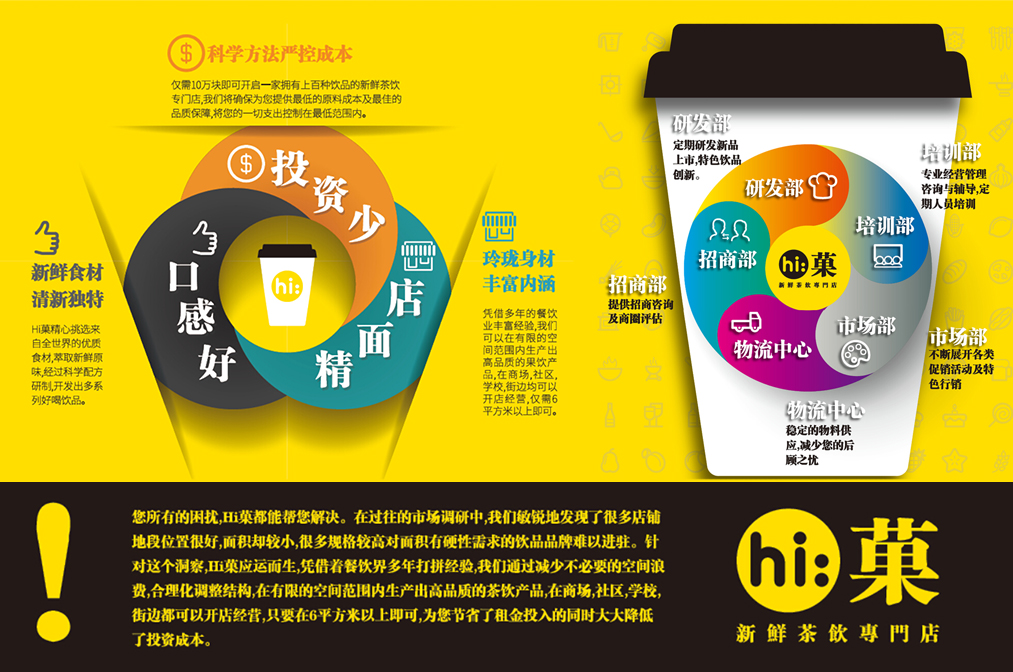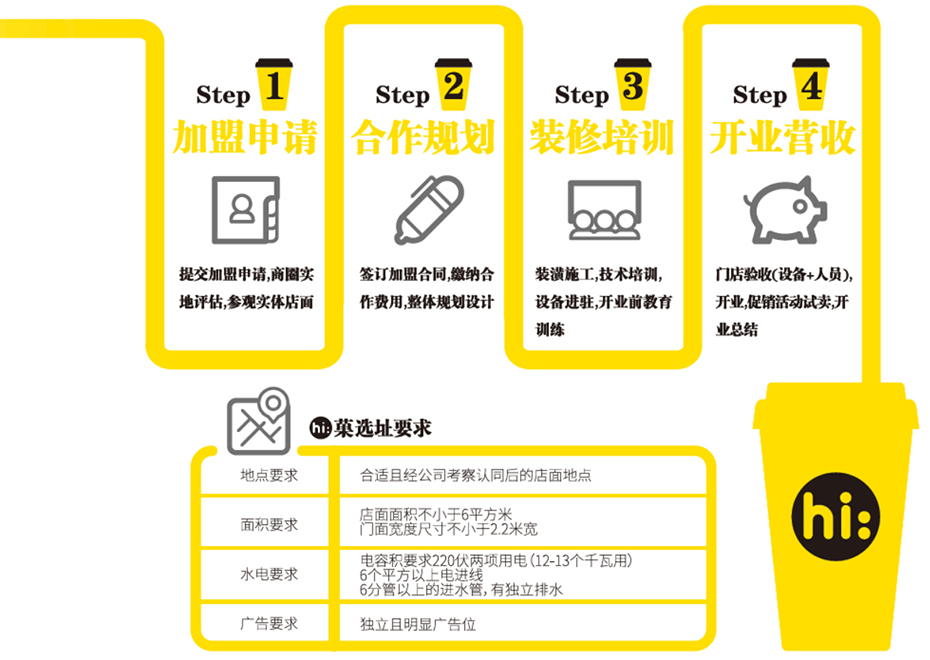 新鮮好喝優質新鮮原材,自動化標準、快速作業方式,簡化從制作到販售的過程,讓消費者從選購到飲用,享用最新鮮, 口感獨特的精致茶飲。統一標準 品質保障為了保證HI菓茶飲的品質,HI菓設計了整套經營標準流程,從新鮮原料的選擇至物流配送,統一標準化,確保品牌的優質呈現。選址靈活HI菓通過減少不必要的空間浪費,合理化調整結構,在有限空間內生產出高品質茶飲,在店面選址上有很大靈活性,選擇面廣,學校、醫院、超市、廣場、步行街、社區等附近都可以開設HI菓店面。
