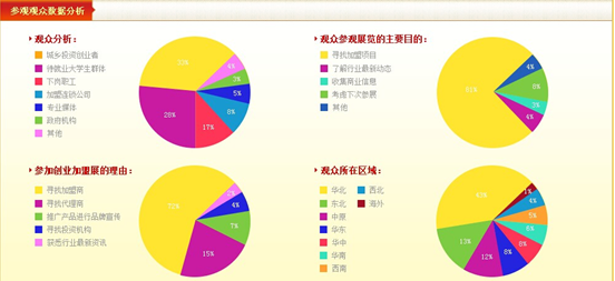另外,主辦方從“第31屆北京國際連鎖加盟展覽會”參展情況得出以下數據:參展觀眾比例,政府機構3% 、專職媒體5%、下崗職工17%、待就業大學生群體28%、城鄉投資創業者33% 、加盟連鎖公司8%、其他4%;所在區域比例,華北43% 、東北13% 、中原12%、華東8%、 華中8% 、華南6% 、西南5% 、西北4%、海外1%;參加創業加盟展的理由比例,尋找加盟商72%、 尋找代理商15%、推廣產品進行品牌宣傳7%、尋找投資機構4%、獲悉行業最新資訊2%;觀眾參觀展覽的主要目的比例,尋找加盟項目81%、了解行業最新動態4% 、收集商業信息3%、考慮下次參展8% 、其他4%。