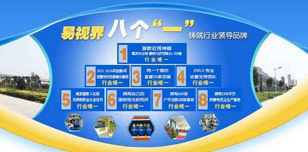 企業(yè)介紹;易視界實(shí)業(yè)集團(tuán),專注于低視力人群的視覺(jué)健康,是專業(yè)從事青少年弱視、近視、遠(yuǎn)視、散光康復(fù)矯正與訓(xùn)練全國(guó)性眼視光科技平臺(tái),是集技術(shù)研發(fā)、生產(chǎn)、技術(shù)培訓(xùn)、品牌輸出、銷售、“OTO網(wǎng)絡(luò)視光醫(yī)院”為一體的全國(guó)性互聯(lián)網(wǎng)+眼健康綜合性集團(tuán)公司。公司核心技術(shù)“近視弱視增視儀”榮獲國(guó)家專利技術(shù),在視覺(jué)健康領(lǐng)域居于行業(yè)領(lǐng)先地位。公司下轄六個(gè)事業(yè)部,六個(gè)視光產(chǎn)業(yè)生態(tài)鏈,二十多個(gè)關(guān)聯(lián)職能部門。