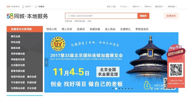 第33屆北京國際連鎖加盟展覽會指定線上合作媒體-58同城招商加盟!有項目想推廣,有錢想投資項目,認準58同城!本次展會58同城攜展團參與,啟動50萬創業者邀約!