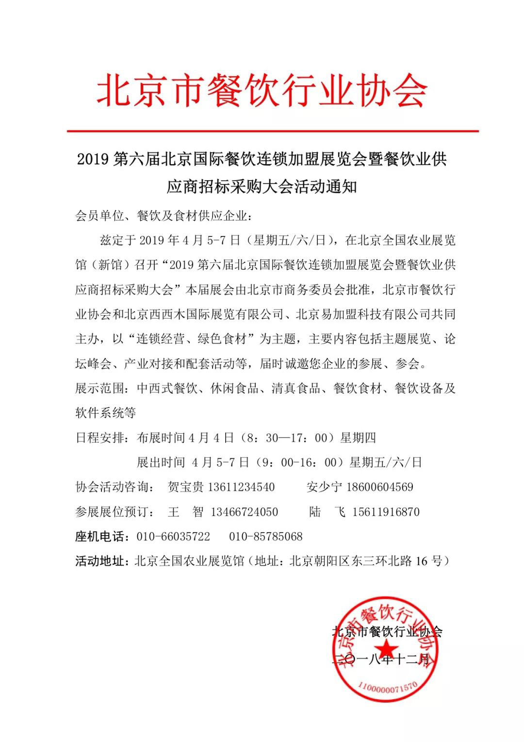 2018-12-13 09:16:30 北京市餐飲行業協會主辦 北京餐飲連鎖加盟展將于4月召開