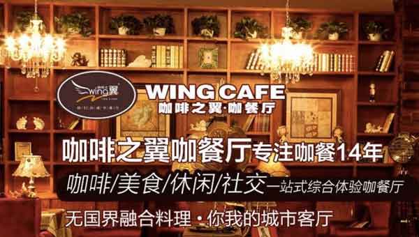 | 加盟詳情 | 咖啡之翼咖餐廳(wing cafe),是香港國際翼咖啡美食傳播有限公司旗下連鎖咖餐廳,專注咖餐14年,中國領先的咖餐廳連鎖品牌,國內咖餐廳概念的首創者和領跑者,咖啡餐飲,休閑社交一站式綜合體驗餐廳。從2000年的第一家餐廳開業以來,公司本著“中西融通、人文創新”的經營理念,以提供與全球風尚同步的“Cafe,Fruit and Fusion Cuisine”(咖餐果飲及無國籍創意美食)、自由人文的環境和人性化互動的服務而迅速成為國內咖餐連鎖行業的風向標和領導者,深受都市白領、小資等追求優質生活品質的城市精英人群的喜愛,成為頗具影響力和號召力的咖餐品牌,先后被評為“中國高成長連鎖企業50強”、“華中十佳品牌西餐廳”、“最受尊敬的企業”、“餐飲名店”、“誠信經營企業”和“消費者信得過單位”、“十大風尚餐廳”等榮譽稱號。